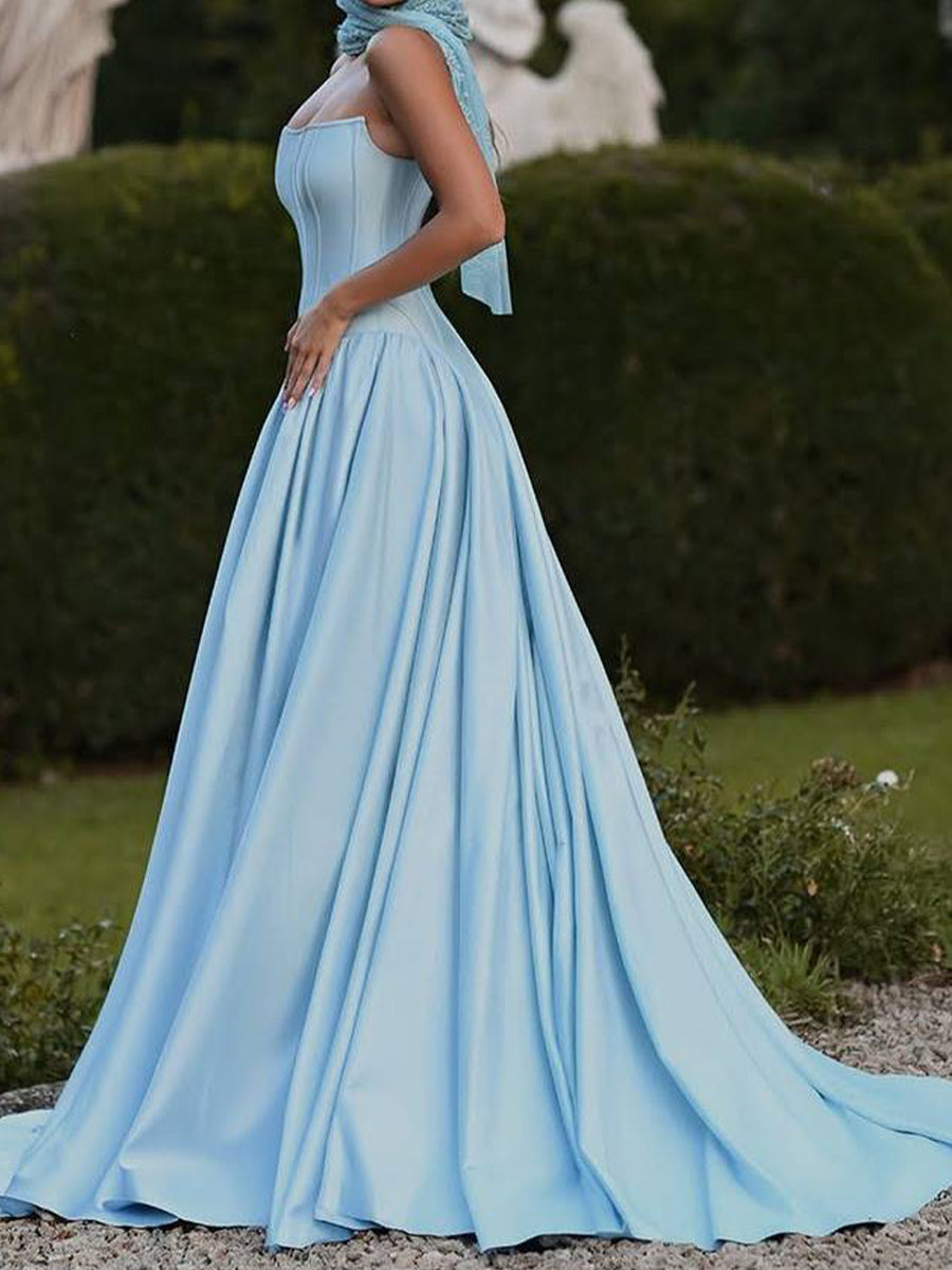 This modern A-line prom dress features a straight neckline and clean pleated detailing. Crafted from stretch crepe, it offers both comfort and structure. The sweep train adds subtle elegance to this minimalist design.