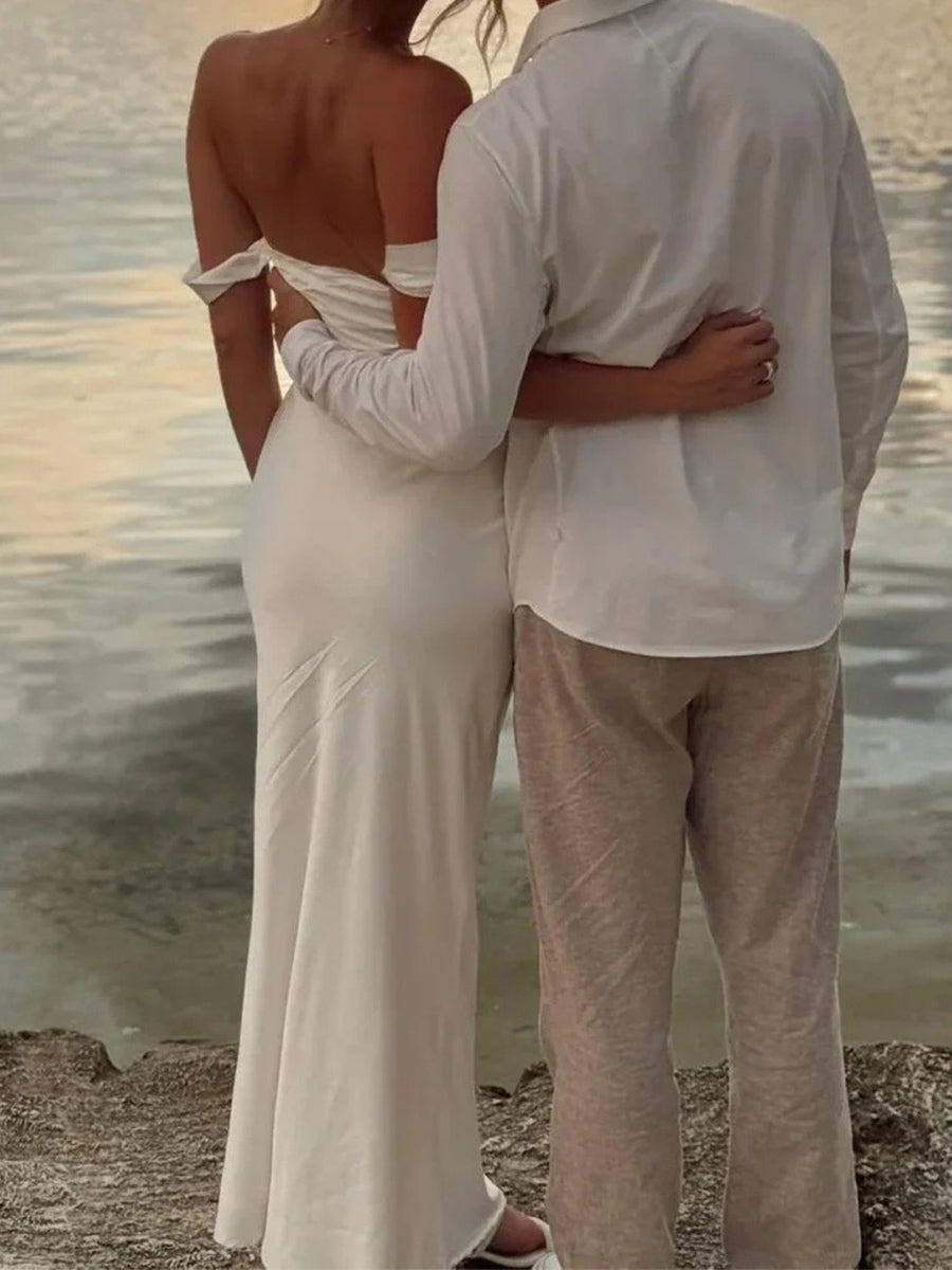 This sheath prom dress features an off the shoulder neckline with elegant pleats. Crafted from silk like satin, the floor length design feels luxurious and refined.